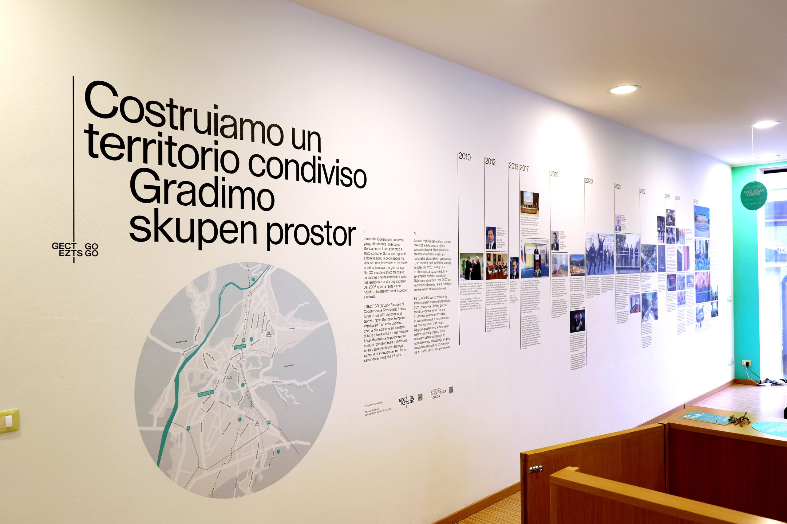 Il programma prosegue con una serie di installazioni e percorsi espositivi che raccontano il progetto nella sua dimensione più ampia. È il caso, per esempio, del progetto Kiss&GO, dedicato al multilinguismo e pensato anche per il pubblico più giovane. E della mostra GECT GO – Costruiamo un territorio condiviso, che ripercorre quindici anni di cooperazione transfrontaliera e i traguardi raggiunti.
