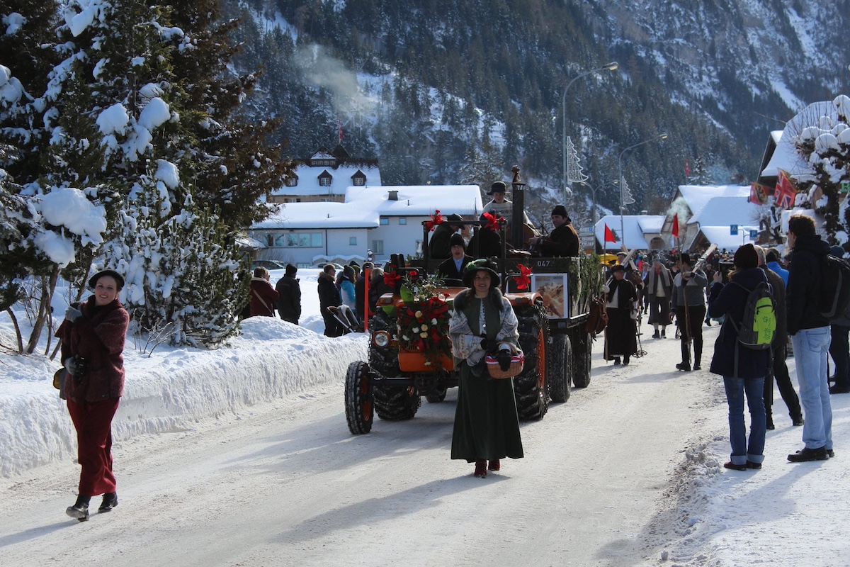 La festa inizia già nel piazzale antistante la stazione, dove piccole bancarelle di legno accolgono i nuovi arrivati con cibo, abiti, scarpe, pellicce e vin brulé. C’è anche una pista di pattinaggio, dove si esibiscono pattinatrici e si disputano partite di hockey, rigorosamente in abiti d’epoca. Avventurandosi per il paese, tra le vie innevate e le case di legno, si incontrano suonatori di strumenti a manovella, calessi storici con coppie e famiglie in costume, e scorci che sembrano usciti da una fotografia di inizio Novecento.